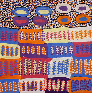 This artwork comes from Warlukurlangu Artists Aboriginal Corporation in Yuendumu, Central Australia. Established in 1985, it is one of the longest running Aboriginal-owned art centres and operates as a 100% Aboriginal-owned, not-for-profit organisation.